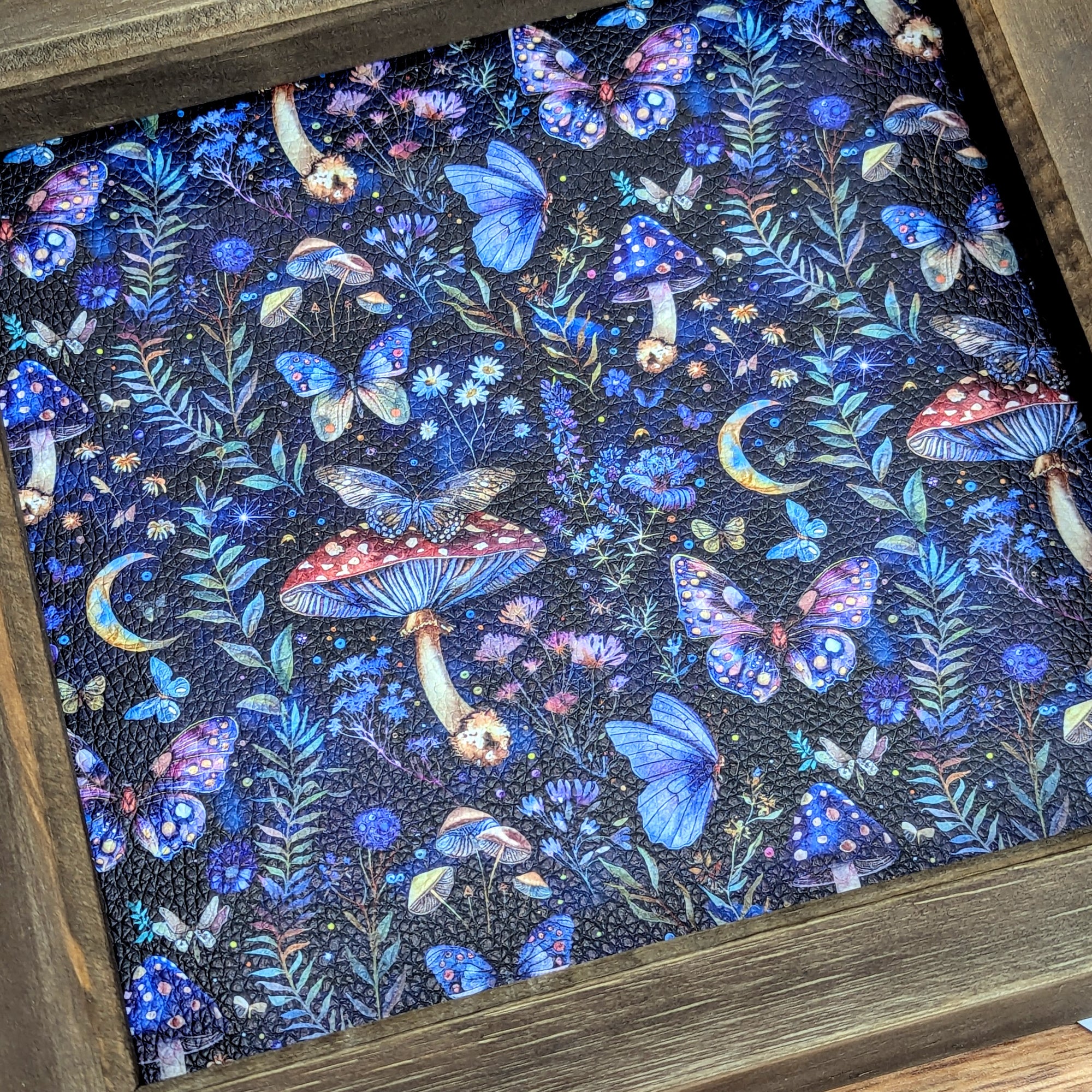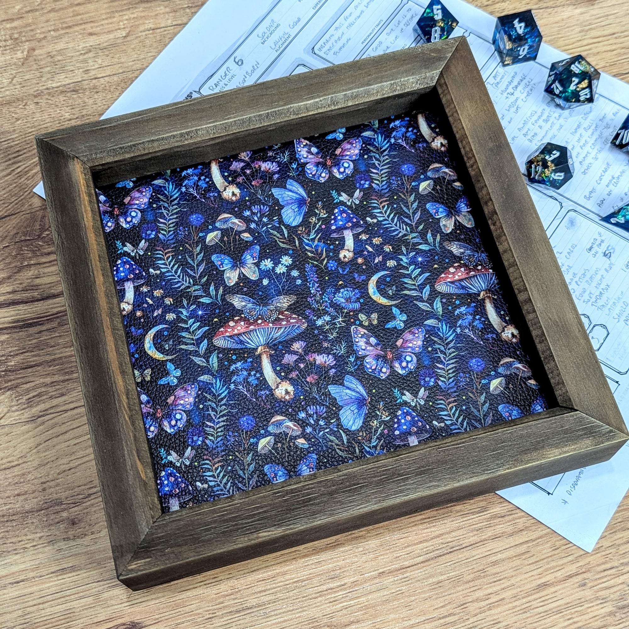 One set of 7 premium sharp edged polyhedral dice, made from clear resin encapsulating a red cap mushroom on a bed of faux grass, finished with silver numbering in a fantasy font. Please note some of the fine grass fibres can be seen in the clear resin upclose, under lights but this is not considered a fault - see photos for details.