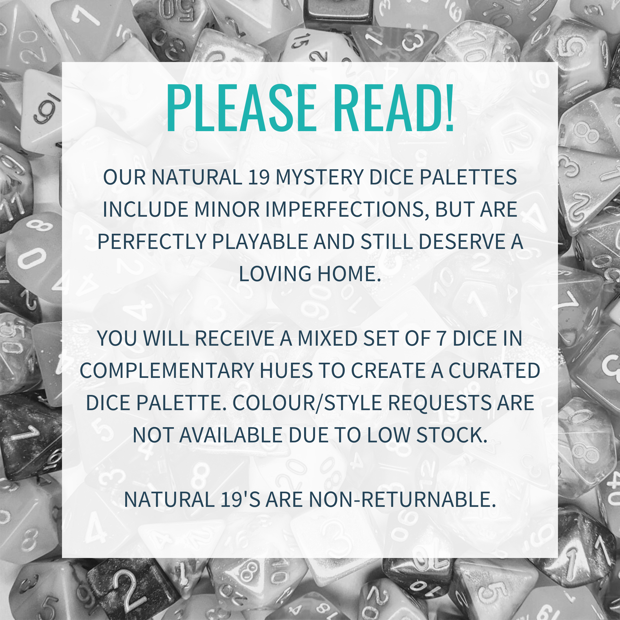 These dice are hand poured and hand finished in small batches for a more premium finish, they also run a little larger than standard dice.
